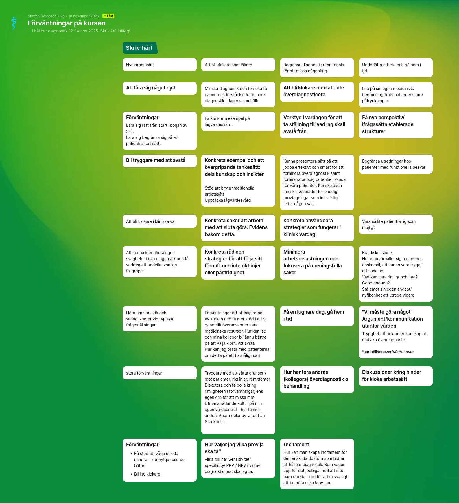 ▶ Kursens hemsida: sfam.se/kurs-i-hallbar-diagnostik ▶ Deltagarnas förväntningar inför kursen (jpg/pdf) ▶ Deltagarnas förslag på sätt att implementera SFAMs Kloka Kliniska Val (jpg/pdf) ▶ [KOMMER SNART] Ett urval bilder med några huvudpunkter från varje föredrag ▶ Två föredrag i sin helhet: Drivkrafter för sjukvårdsexpansion och Hormonell obalans (bläddra med mellanslag eller pilar, tryck på “escape” för översikt!) ▶ Figurer om medikalisering och överdiagnostik: https://pharm.nu/od-fig ▶ Andra relaterade men osorterade bilder: https://pharm.nu/bild